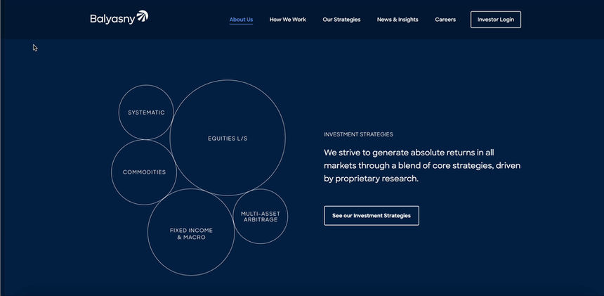 Key for Balyasny was conveying a sense of connectivity among all of their teams. Each is unique, yet impacts the other, making the firm more dynamic and the outcomes better for their clients. We wanted the look, feel and UI of the site to reinforce that -- particularly when introducing what Balyasny does best.